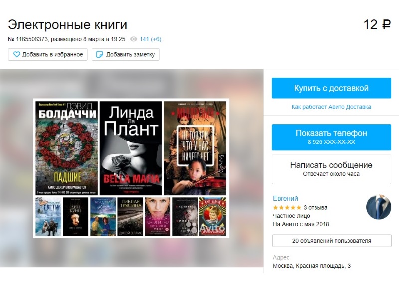 Книги в fb2, epub, pdf и других форматах продаются на Avito по цене от 12 рублей и выше — то есть в десятки раз дешевле, чем в легальных сервисах (например, на «Литрес»). Пираты принимают оплату на банковские карты, электронные платёжные системы, счета телефонов и отправляют книги электронной почтой.