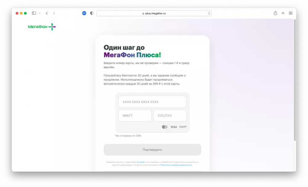 Если вы не являетесь абонентом МегаФона, то нужно привязать к сервису банковскую карту — будет списан 1 рубль и отменен для подтверждения карты.