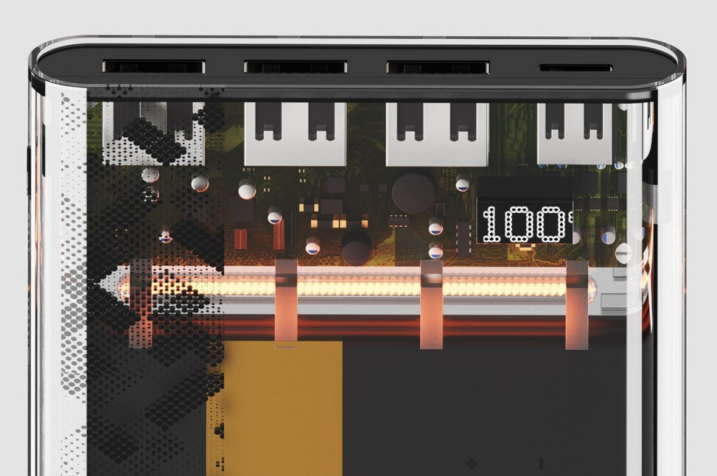 Похоже, что дизайнеры, смотрящие на Nothing Phone, чувствуют неудержимую тягу сделать прозрачными все предметы вокруг себя. Концептуальный powerbank не исключение: он заключен в полностью прозрачный корпус и пользователь может наблюдать внутренние компоненты аксессуара.