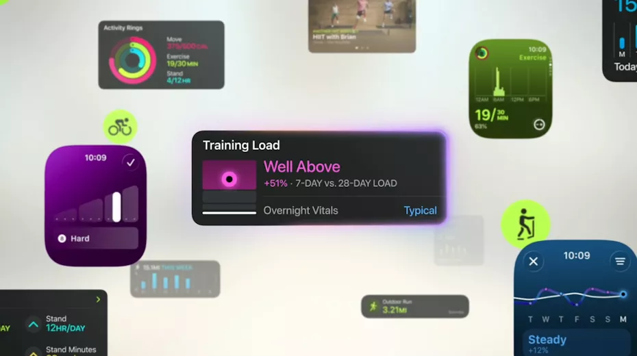 Apple Intelligence революционизирует фитнес с помощью «Тренера» (Workout Buddy). Он анализирует текущие данные тренировки (пульс, темп, дистанция) и историю активности пользователя (кольца активности, личные рекорды), чтобы генерировать персонализированные устные подсказки и мотивацию в режиме реального времени. Например, он может напомнить о текущем недельном пробеге, прогрессе колец или поздравить с новым рекордом. Приложение «Тренировка» получило самое значительное обновление интерфейса и навигации с момента своего создания, включая четыре новых угловых кнопки для быстрого доступа к избранным функциям. Теперь также можно настроить автоматическое воспроизведение музыки или подкастов при начале тренировки, причем Apple Music будет подбирать плейлист исходя из типа активности и вкусов пользователя.
