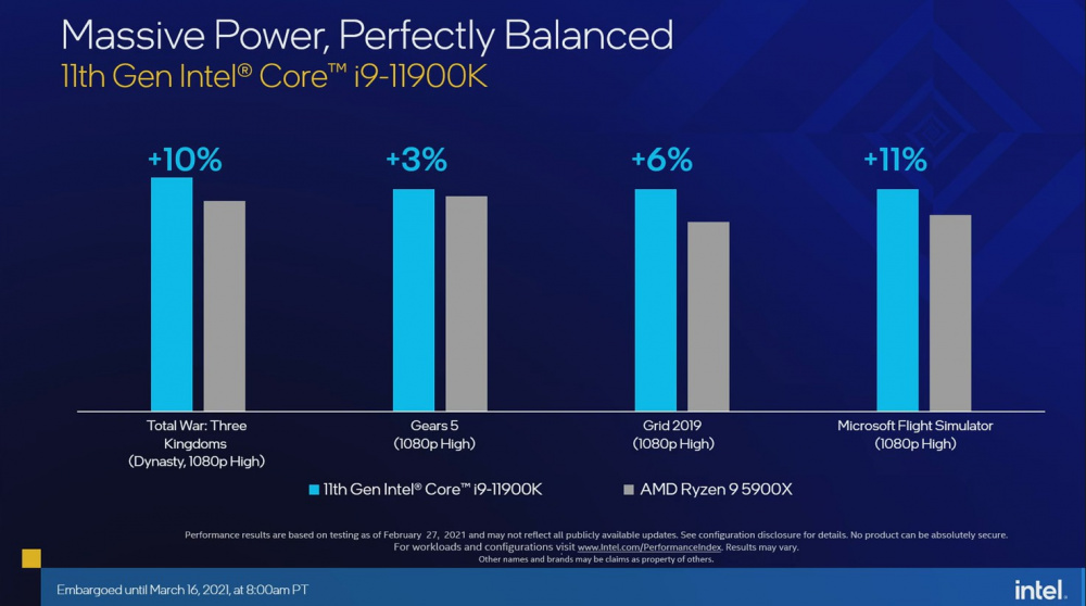 Что касается совместимости, то на новых материнских платах заработают предыдущие процессоры Intel 10-ого поколения (Comet Lake-S), а вот наоборот — нет: поддержку новых Rocket Lake-S получат лишь старшие чипсеты 400-ой линейки (все кроме H410 и B460). Также Intel продемонстрировала производительность новых CPU. По их данным, флагманский 8-ядерный Core i9-11900K на 3-11% быстрее в играх в FHD, чем 12-ядерный Ryzen 9 5900X. Если же сравнивать новинку с предыдущим флагманом, Core i9-10900K, то прирост еще ощутимее — от 8 до 14%.