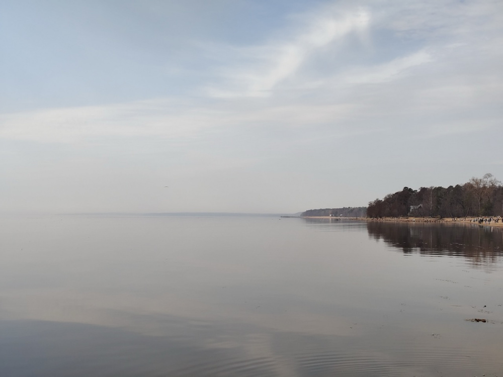 Над заливом была интересная дымка — вода будто слилась с небом. Линию горизонта сложно различить.