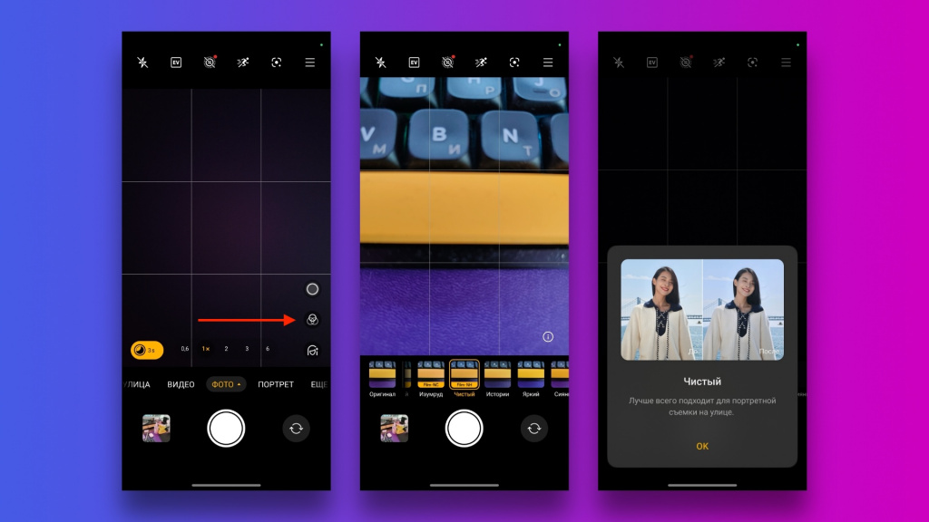 Основной режим, он же «Фото», предлагает больше возможностей, чем может показаться на первый взгляд. Они аккуратно расставлены по интерфейсу, чтобы не смущать любителей метода «навел и снял».Помимо привычного переключателя фокусных расстояний (0,6x, 1x, 2x, 3x и 6x) есть кнопка доступа к настройкам освещения. Здесь доступны пять пресетов: Дежавю, Ретро, Туман, Светящий и Мечтательный. Они позволяют сделать акцент на свете в портретной съемке.