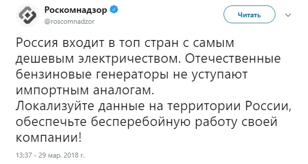 На этом Роскомнадзор не остановился. Следующим сообщением в твиттере он предложил иностранным компаниям (к которым относится Telegram) переносить дата-центры в Россию: