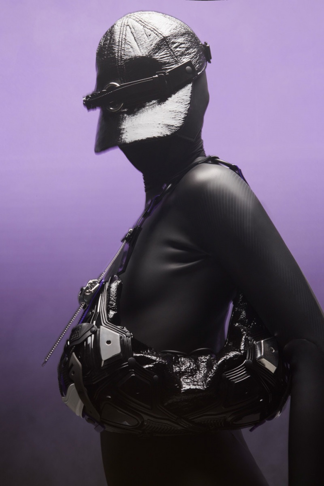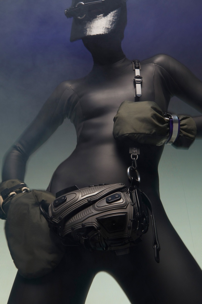При создании кибер-рюкзака дизайнеры использовали конструкцию из легкой матовой смолы черного цвета и других гипоаллергенный деталей, включая пластиковые карабины и заклепки.