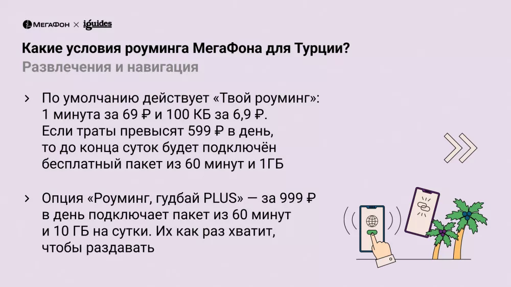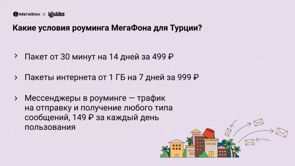Для Турции по умолчанию действует услуга «Твой роуминг». Условия следующие: 1 минута звонков обойдется в 69 рублей, а стоимость 100 КБ интернета составит 6,9 р. При тратах на связь более 599 рублей МегаФон предоставит до конца дня бесплатный пакет, в который войдут 60 минут и 1 ГБ. Также есть возможность подключения опции «Роуминг, гудбай PLUS» — за 999 р. в день подключается пакет из 60 минут и 10 ГБ на сутки. Пакеты из 30 минут и 3 ГБ на 14 дней обойдутся мне в 499 и 1999 рублей соответственно. Другие варианты пакетов: