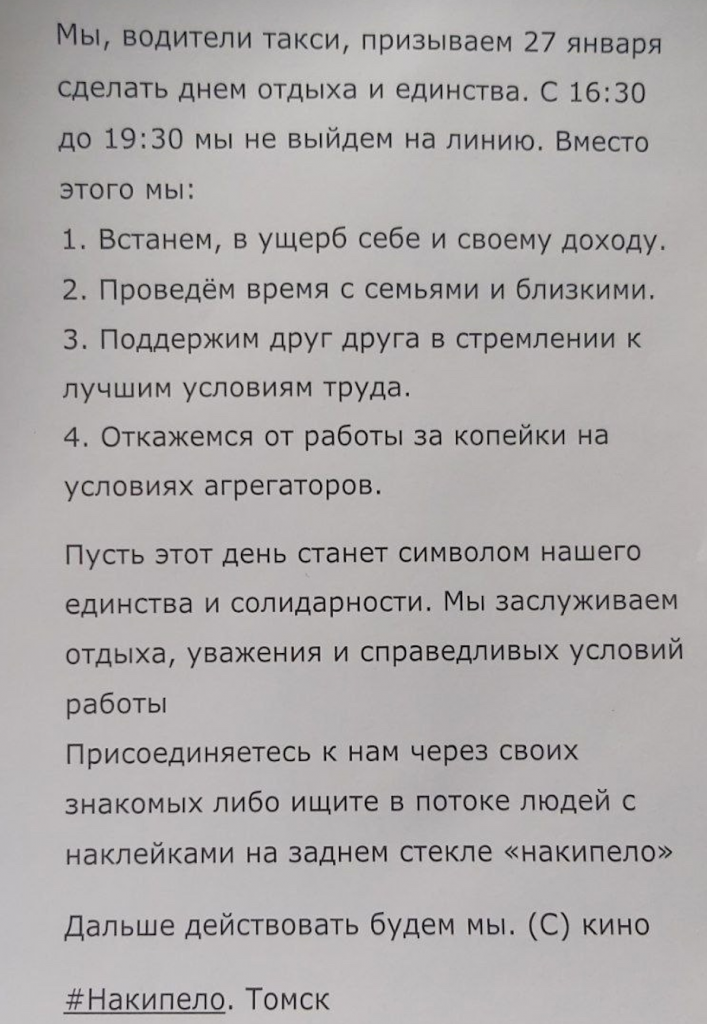 В соцсетях и мессенджерах распространяются призывы к таксистам не выходить на линию в определённую дату в течение нескольких часов. Это уже вторая забастовка с начала года, первая прошла незамеченной и пока нет никаких предпосылок к тому, чтобы вторая была успешнее.