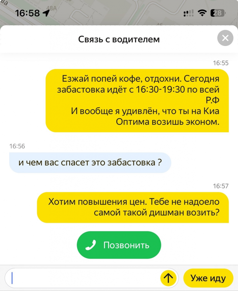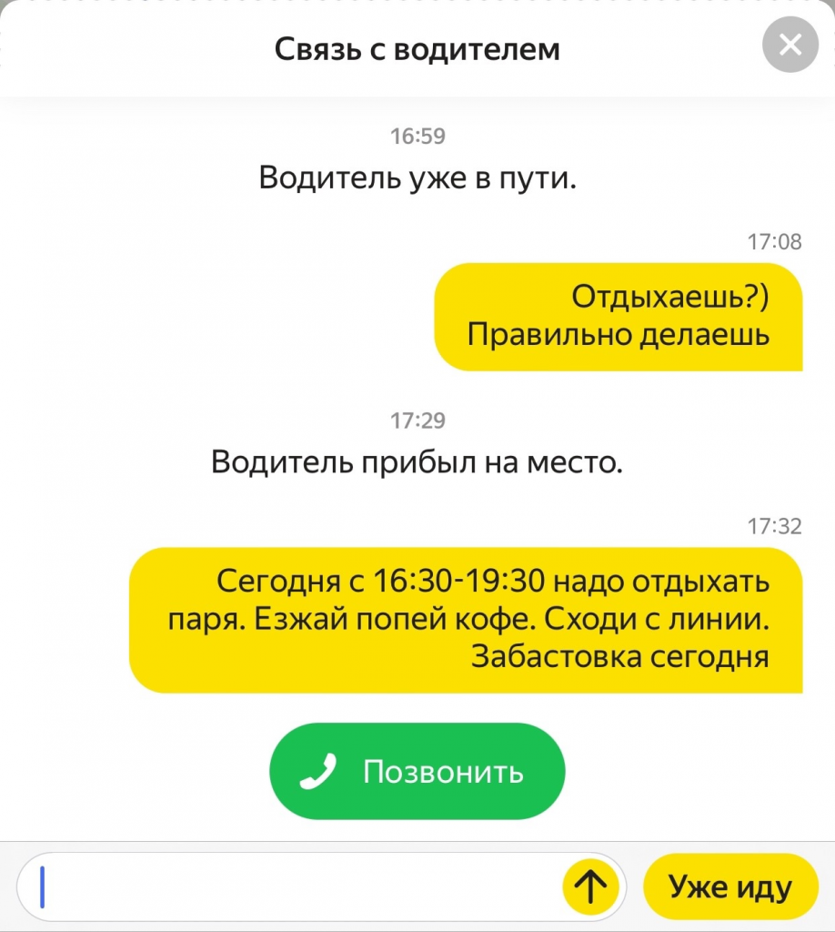 Некоторые таксисты пошли на сомнительные меры. Они сидели дома, вызывали такси, а принявшему заказ сообщали в чате о забастовке и требовали, чтобы он уходил с линии. Особо активные оповещали таким образом всех таксистов, которые были поблизости, за исключением тех, что возят только за наличные.