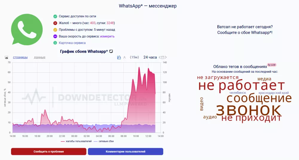 Согласно жалобам на Downdetector, отправка и прием сообщений сбоят, невозможно совершать аудио- и видеозвонки. Больше всего на мессенджеры жалуются в Москве, Санкт-Петербурге, Карелии и Магадане.