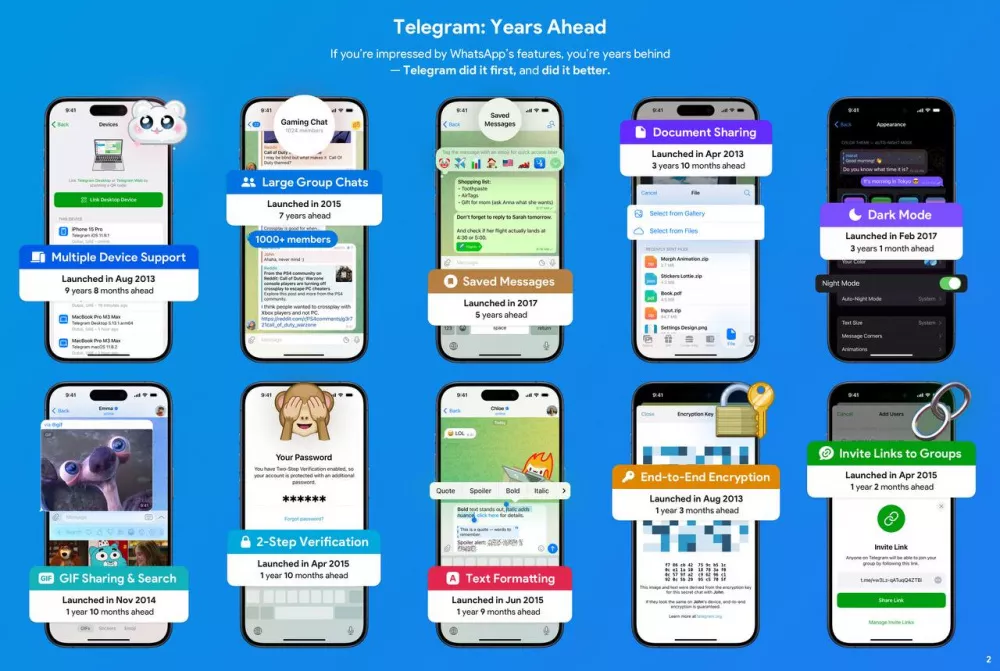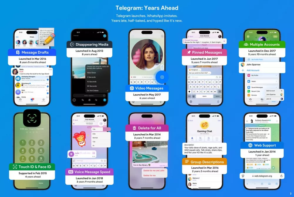 Он также привёл инфографику, показывающую, что Telegram внедрил многие функции гораздо быстрее, чем это сделал WhatsApp:
