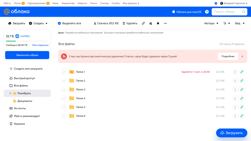 Разработчики добавили хранилищу «Облако Mail.ru» новую возможность. Теперь пользователи могут самостоятельно выставить срок автоудаления доступной по ссылке папки, а за несколько дней придёт уведомление с напоминанием.