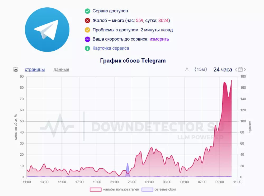 Сбой подтверждается сайтом Downdetector и наблюдаются на момент написания материала. У WhatsApp начались сегодня около 4:30 по Москве, Telegram сбоит по нарастающей, начиная со вчерашнего дня. В основном на работу мессенджеров жалуются в Москве, Санкт-Петербурге, Калиниградской области, а также жители Приморского и Ставропольского края.