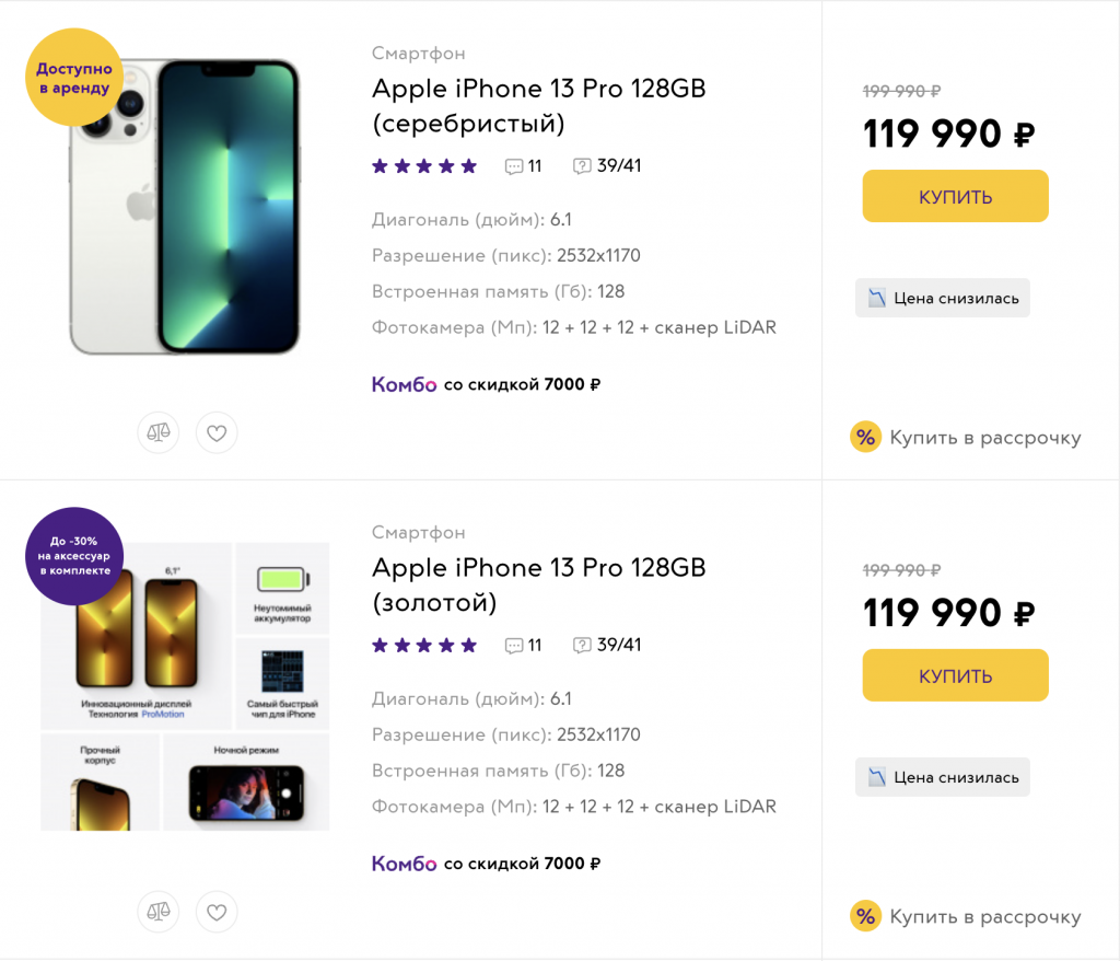 Любопытно, что у официальных реселлеров в РФ ценник по сравнению с осенью 2021 года даже подрос: самый дешевый iPhone 13 Pro в «Связном» стоит 119 990 рублей (против 99 990 на старте), а в DNS-SHOP эту же модель предлагают за 114 990 рублей. Объем накопителя остается тем же — 128 Гб.