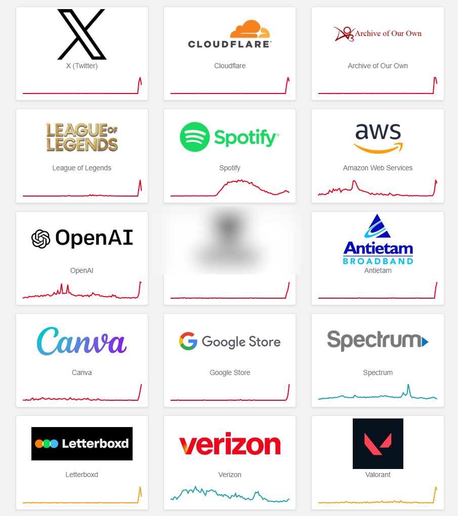 По данным мониторинговых сервисов, проблемы наблюдаются у соцсети X (экс-Twitter), музыкального сервиса Spotify, многочисленных новостных и корпоративных сайтов, облачных сервисов и API, онлайн-игр. Логичным образом жалобы поступают на мобильных операторов.