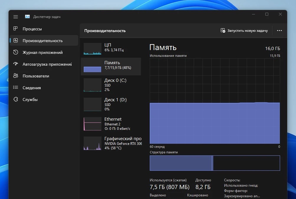 «Диспетчер задач» наконец приведен в полное соответствие с дизайном Windows 11 — он получил скругленные углы, более широкую расстановку элементов, поддержку прозрачности, акцента цветов интерфейса и темную тему. Вкладки были заменены на боковое меню.