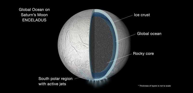 Ученые думают, что на дне этого океана могут быть разломы коры, где горячие породы смешиваются с холодной водой. Такое смешивание горячего и холодного материала, по-видимому, создает бульон из химических соединений, которые могут поддерживать жизнь.