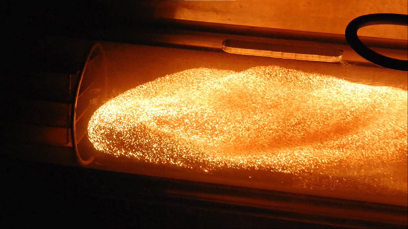 Конвейерная печь: по ленте оксид железа транспортируется через печь, в которую добавляется водород при температуре 800-1000 °C. Оксид железа восстанавливается до железа, которое слипается из-за жара, образуя металлический слой. Затем его можно измельчить, чтобы вновь получить железный порошок.