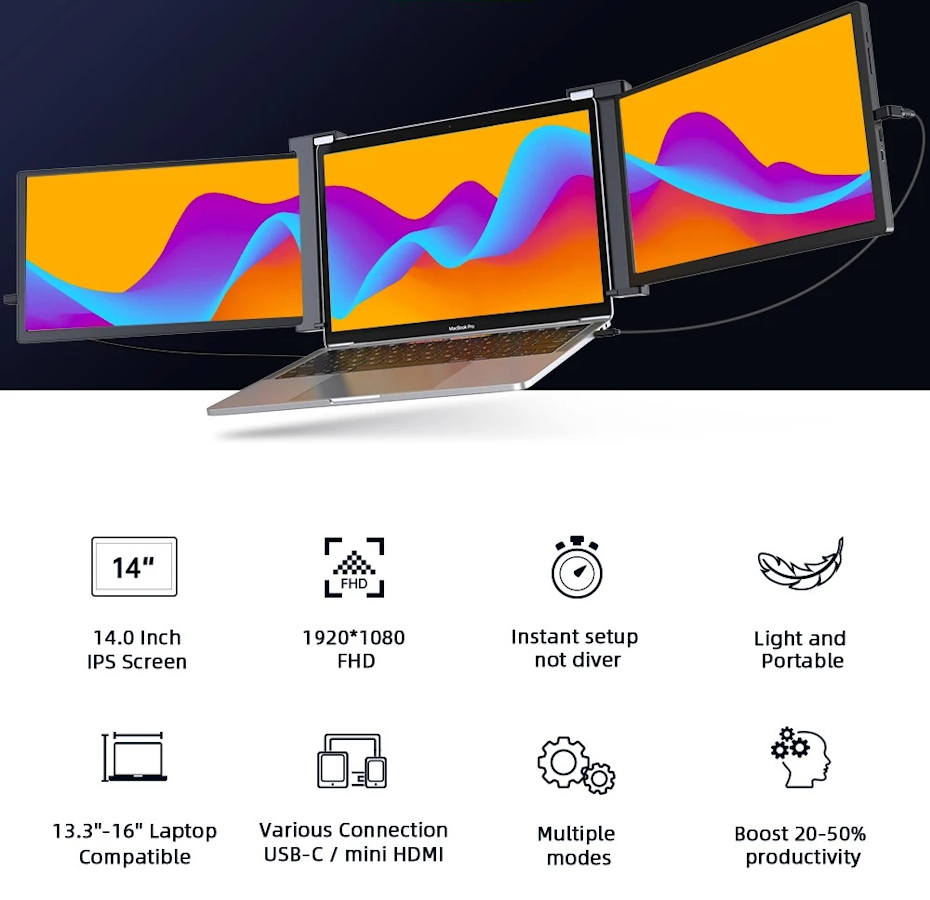 Основной экран ноутбука необязательно должен быть 14-дюймовым, расширитель подходит и для моделей меньшего или больше размера. Такой гаджет оценят геймеры, у которых появится обзор гораздо большего игрового пространства даже в сравнении с обладателями ультрашироких мониторов. Он также пригодится тем, кто создаёт контент графический или кинематографический контент, ведь так появляется возможность держать перед глазами сразу несколько проектов. Будут довольны и финансовые специалисты, которым важно следить за различными графиками. Кроме того, с таким экраном появляются огромные возможности многозадачности для любых пользователей, поскольку можно одновременно работать в какой-нибудь программе, смотреть фильм и следить за новостями или публикациями в соцсетях. В общем, супер-находка для тех, кому тесно в экране ноутбука, но не хочется быть привязанным к столу с громоздким ПК и несколькими мониторами.