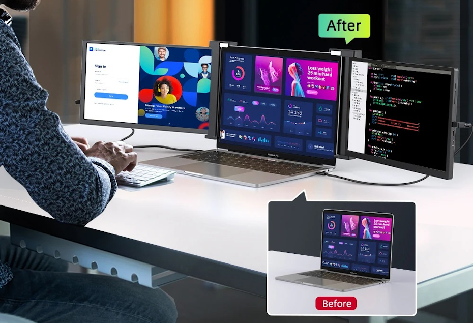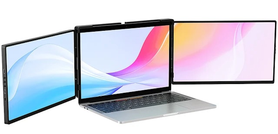 Среди обладателей ноутбуков становится популярен новый девайс Uperfect Z Pro — его за неимением лучшего названия называют расширителем экрана. По сути это два дополнительных монитора, которые надеваются на верхнюю крышку устройства и в три раза увеличивают площадь рабочего пространства.