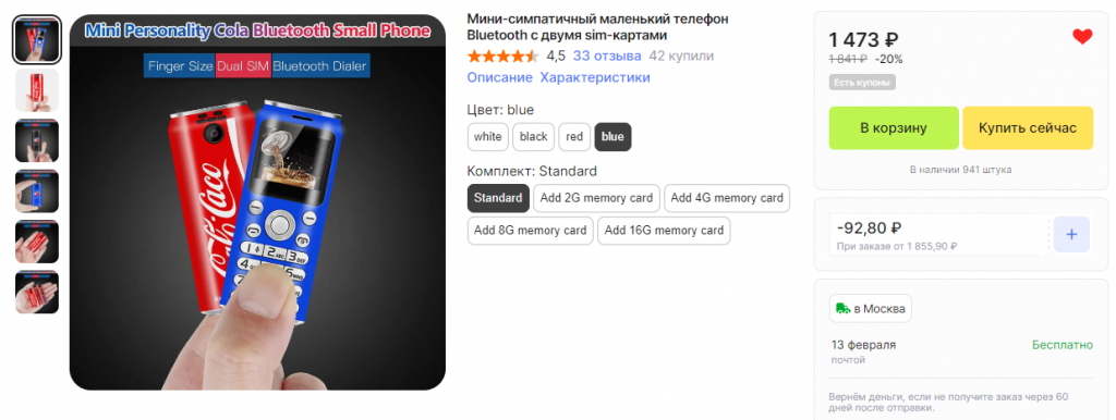 Малюсенький телефон в виде банки с кока-колой или пепси-колой. Его габариты всего 67,2×29×1,8 мм при весе 27,6 г. — и в такую кроху как-то умудрились запихать цветной экран диагональю 1 дюйм со стеклянным покрытием, процессор MediaTek MTK6261DA, камеру на 0,3 Мп, 64 МБ памяти, слоты для двух SIM-карт, модуль Bluetooth и аккумулятор на 600 мАч с зарядкой через micro USB. В наличии четыре цвета — белый, красный, синий и чёрный. Проблема удобства разговора по телефону решена возможностью подключения беспроводных наушников. Кроме того, этот телефон можно использовать в качестве пульта дистанционного управления смартфоном.
