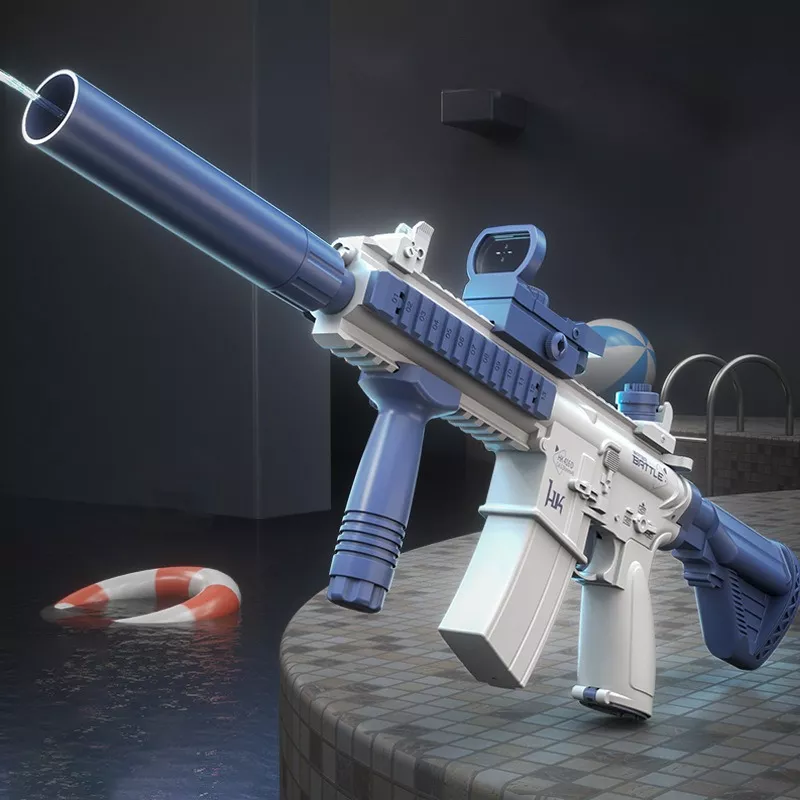 Для тактиков. У неё есть коллиматорный прицел, ручка, приклад и даже глушитель. Сражение можно вести с более точно предельностью, ну, и так значительно антуражнее бегать от укрытия к укрытию. Перезарядка также с запасом — заливается в отсек, расположенный сверху. Стреляет длинной струёй.Купить водяной пистолет на AliExpress
