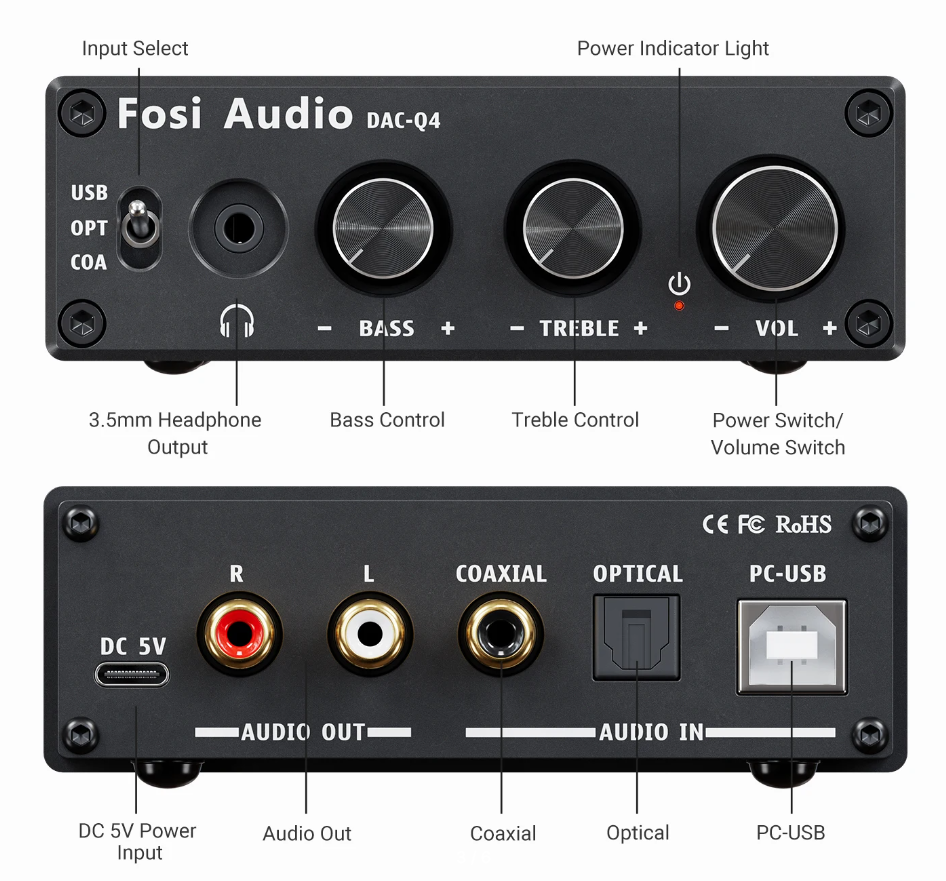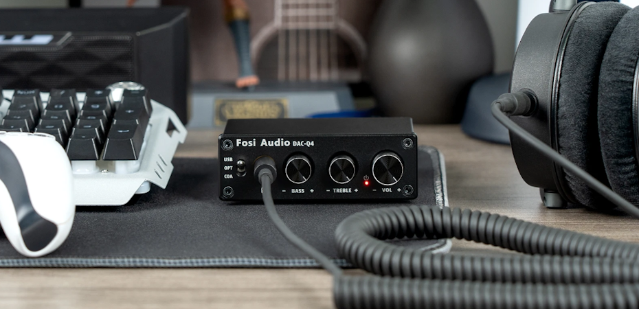 Fosi Audio Q4 Mini подключается к компьютеру через два разъёма USB: Type-C используется для питания и Type-B для передачи звукового потока. Также есть оптический и коаксиальный входы на случай подключения к аппаратуре, которая поддерживает эти интерфейсы (например, телевизор). На задней панели имеется линейный выход с RCA-разъёмами (они же «тюльпаны»), чтобы вывести звук на усилитель, а через него на колонки.