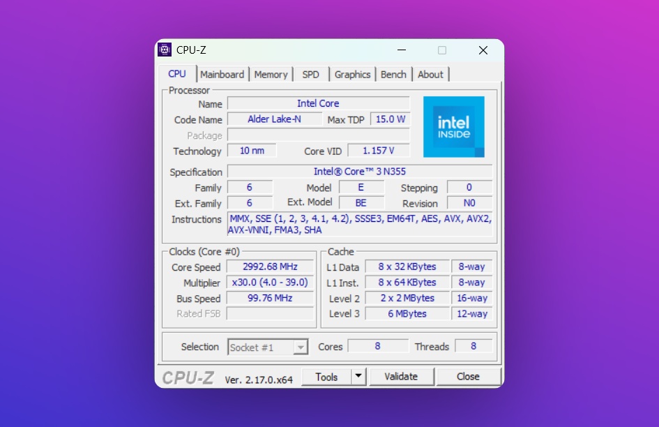 - Процессор: 8-ядерный Intel Core 3 N355 1.9 ГГц (3.9 ГГц, в режиме Turbo)