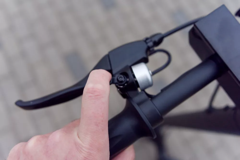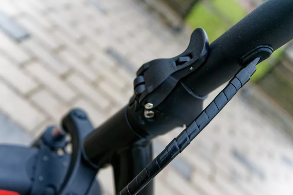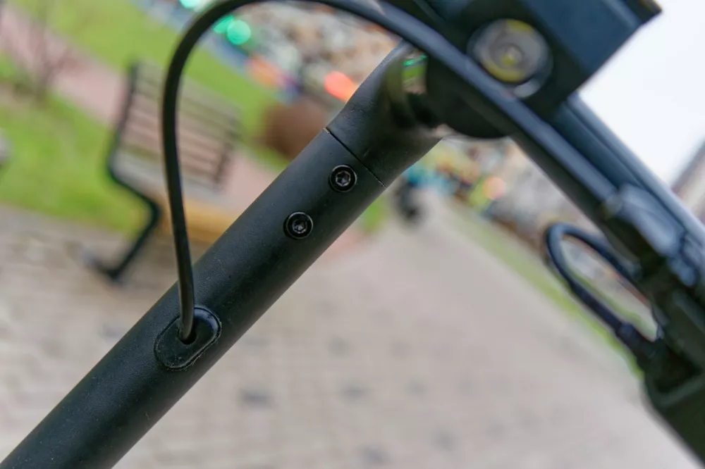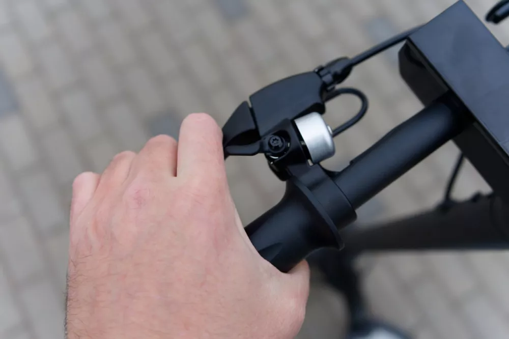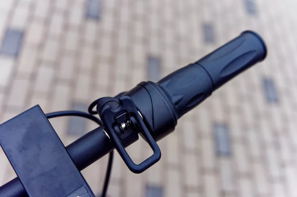 Буквально несколько слов о складном механизме. Acer ES Series 5 поставляется в сложенном виде. Перед первой поездкой не нужно будет заморачиваться со сборкой — достаточно прикрутить руль четырьмя болтами. Для этого в комплекте имеется отвертка. Процесс складывания-раскладывания очень простой — откидываем специальный «кран» на рулевой стойке и пристегиваем её с помощью защелки на руле к креплению на заднем крыле. Готово. В таком виде можно закинуть самокат в багажник такси. По моим ощущениям руль хотелось бы немного пошире. Он представляет собой цельную конструкцию — ручки не съемные. Над левой рукояткой закреплена ручка тормоза и курок звонка. Тормоз может показаться довольно жестким, но рекомендую подтормаживать плавно, поскольку на ходу он довольно чувствителен к нажатию. Слева от правой рукоятки размещен фиксатор крепления руля к крылу в сложенном состоянии. Еще одна отличительная особенность — ускорение осуществляется поворотом правой рукоятки. Все по «взрослому», как на мотоциклах. Поначалу такое решение немного непривычно, но к нему привыкаешь буквально спустя 15 минут первой поездки.