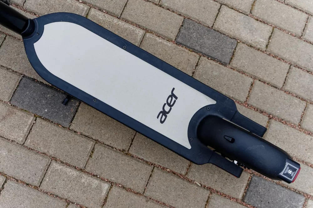 Первое, что хочется отметить — ширину деки. Acer ES Series 5 стал первым электросамокатом на котором, мне очень комфортно передвигаться с моим 45-м размером ноги. Ступни удобно располагаются на деке. У неё светлая поверхность, а в основании нанесен логотип бренда. Она «шершавая» и напоминает «шкурку» скейта, поэтому обеспечивается надежное сцепление с подошвой обуви.