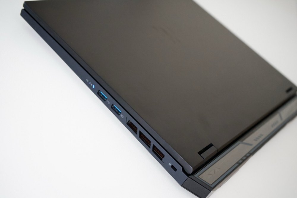 Первая отличительная особенность портативной геймерской станции от ноутбука — есть все необходимые порты, никаких компромиссов по количеству и типу разъемов. На левой грани, помимо решетки вентиляции, размещены: Ethernet (RJ-45), USB-A 3.2 Gen1, слот для карт памяти microSD и 3,5 мм для подключения проводной гарнитуры. На заднем торце: проприетарный разъем питания (за его вынос сзади отдельное спасибо), HDMI 2.1 и два USB-C (Thunderbolt 4 с поддержкой DisplayPort и PowerDelivery). Справа: два USB-A 3.2 Gen2 и пара индикаторов состояния.
