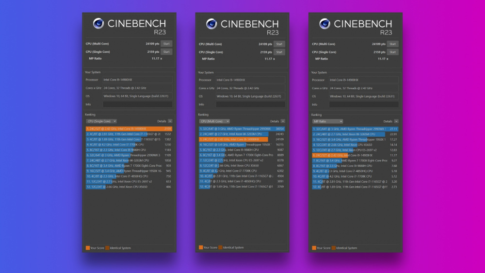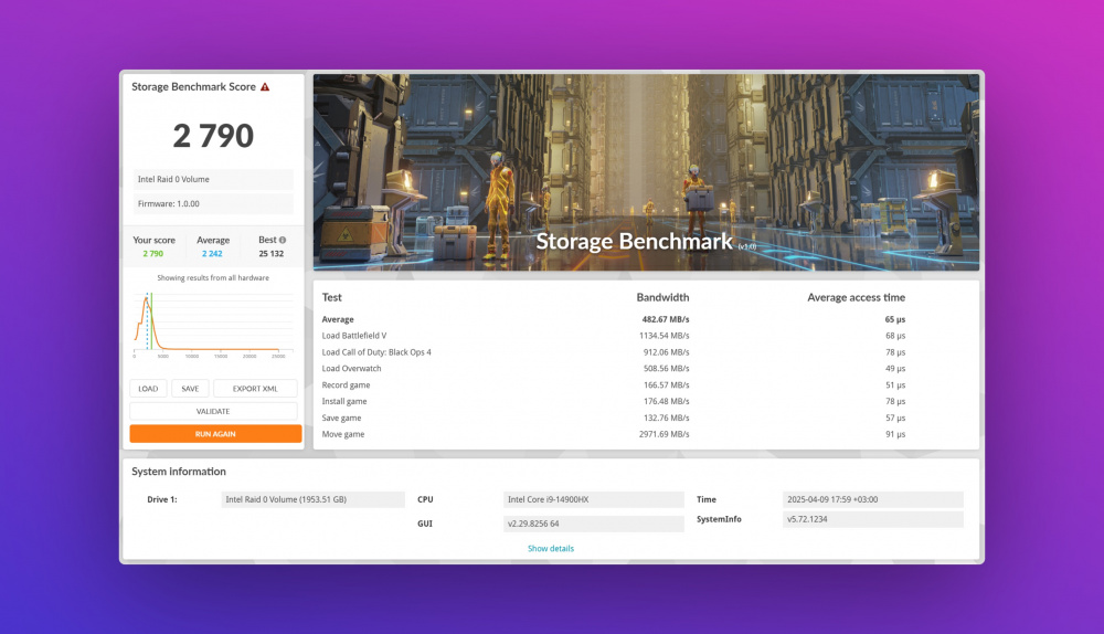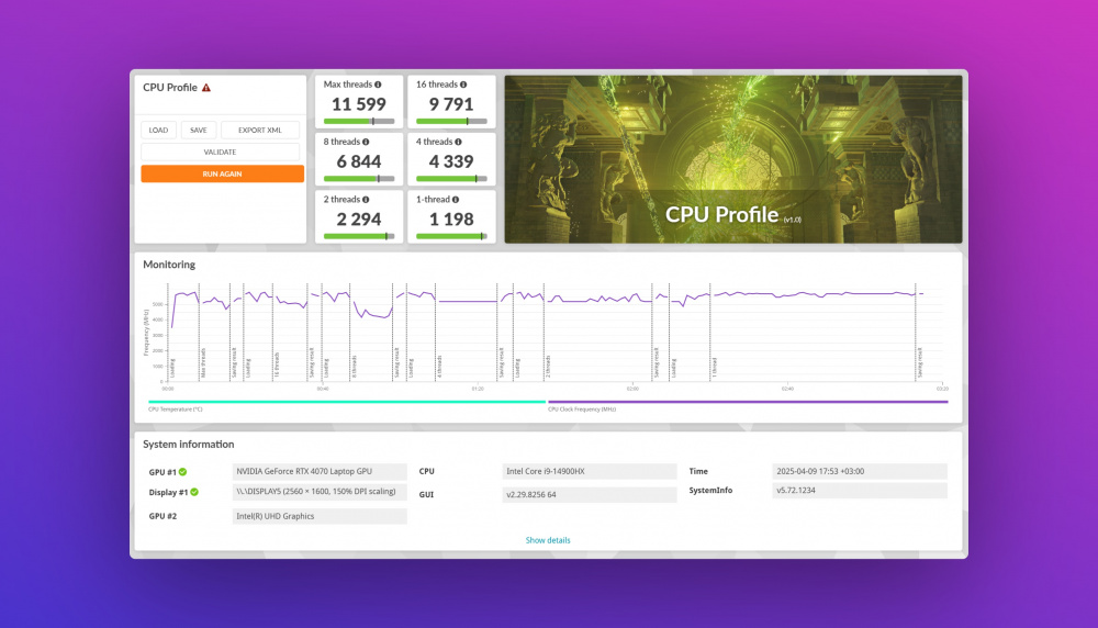Аппаратная платформа нашего тестового образца: процессор Intel Core i9-14900HX 14-го поколения (2,20 ГГц), 32 ГБ оперативной памяти, накопитель на 2 ТБ и графика NVIDIA GeForce RTX 4070 с 8 ГБ видеопамяти GDDR6. Возвращаюсь к упоминанию апгрейда. Да, такая возможность присутствует, но с такими спеками вряд ли пригодится в ближайшее время. Протестировали ноутбук в Cinebench, CrystalDiskMark и Geekbench. Скриншоты с результатами — ниже. Поскольку у нас на тесте геймерское устройство, то мы в обязательном порядке добавляем 3DMark. За охлаждение отвечает система из двух вентиляторов и четырех радиаторов. Захват воздуха происходит через отверстия в нижней поверхности, а отработанный горячий выбрасывается через отверстия, которые находятся по бокам.