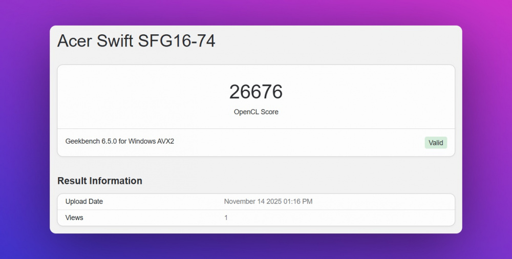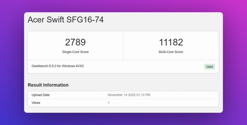 Ноутбук показал достаточный запас производительности. Устройство можно приобретать смело на длительную перспективу. Acer Swift Go 16 AI отлично подойдет для работы с нейросетями, монтажа 4K-видео, пакетной обработки фотографий и конечно же он без труда справится с офисными приложениями, а также хорошо себя проявит в базовых задачах.