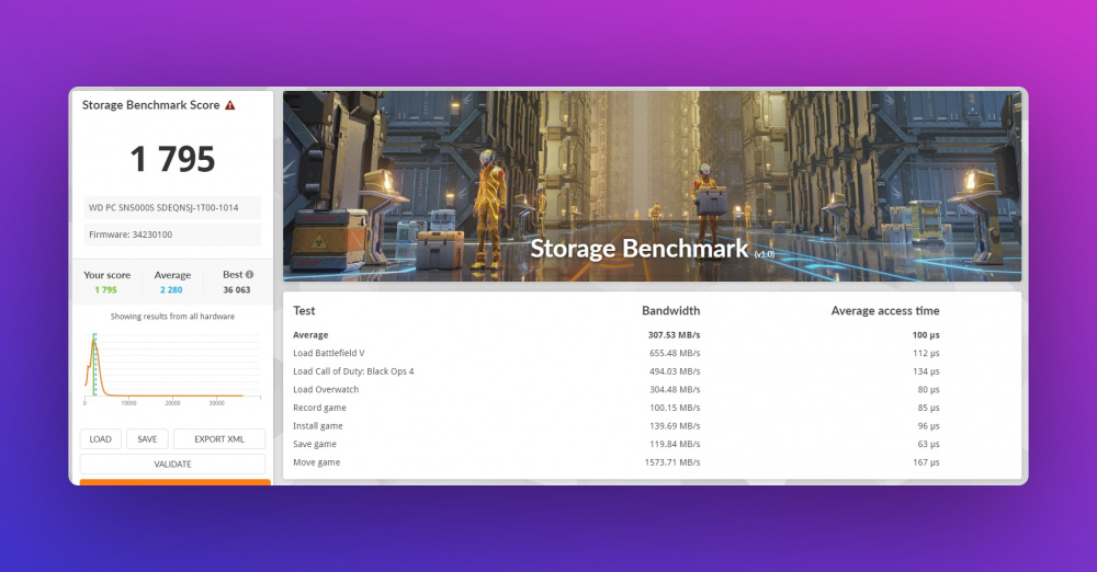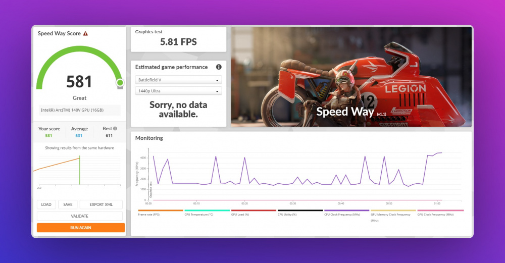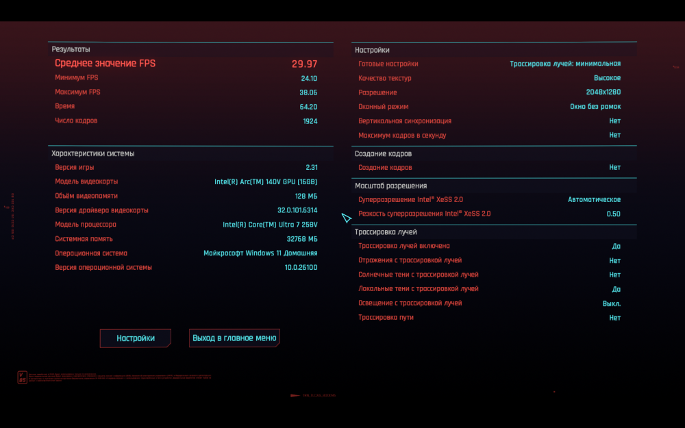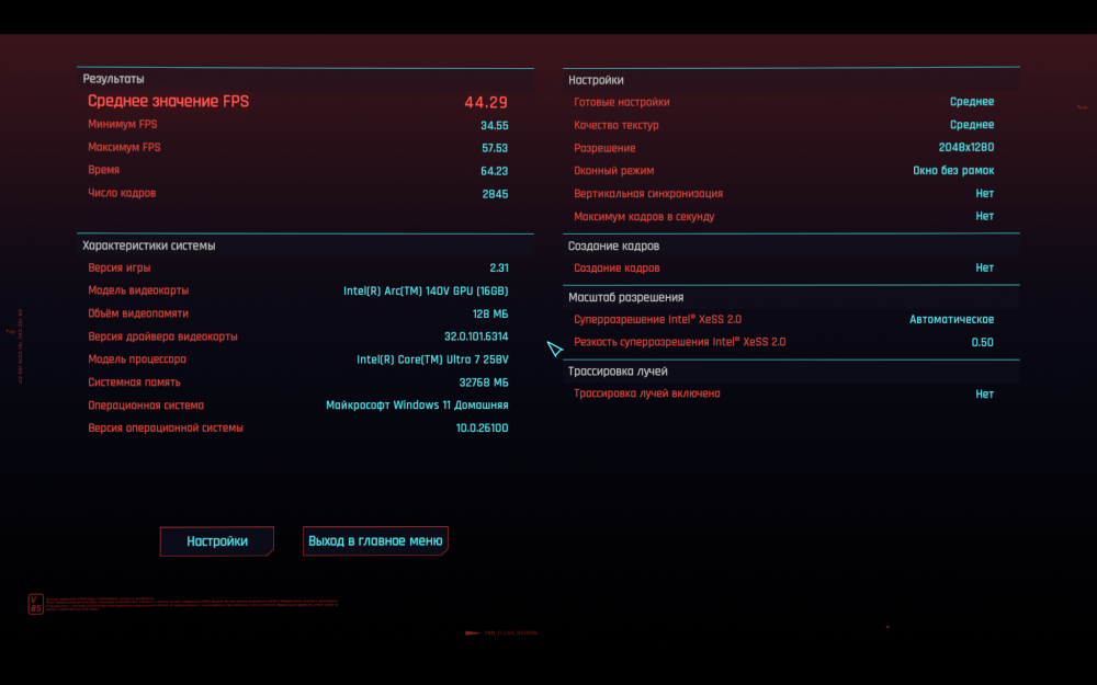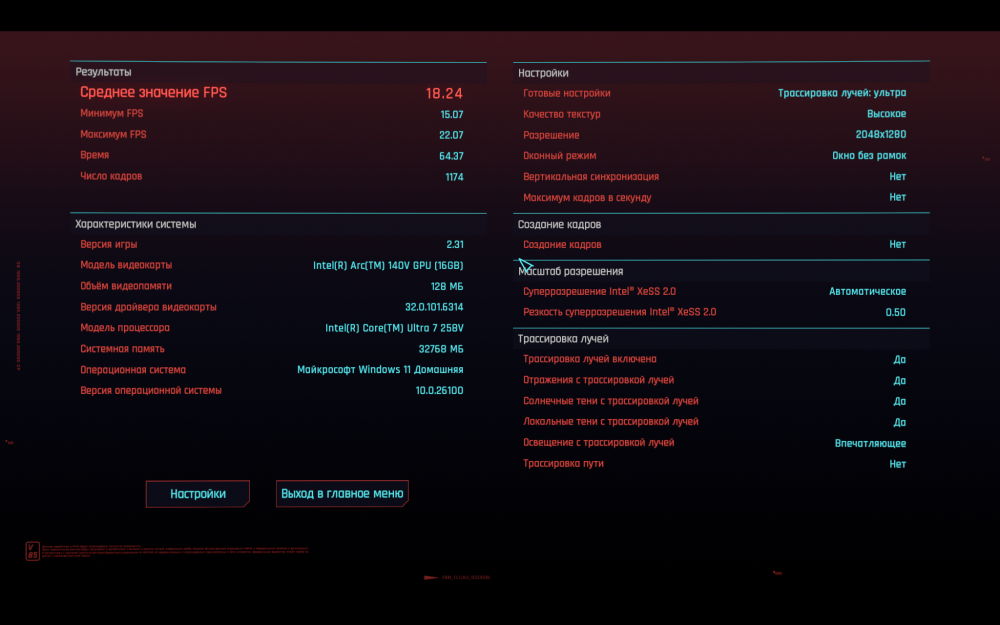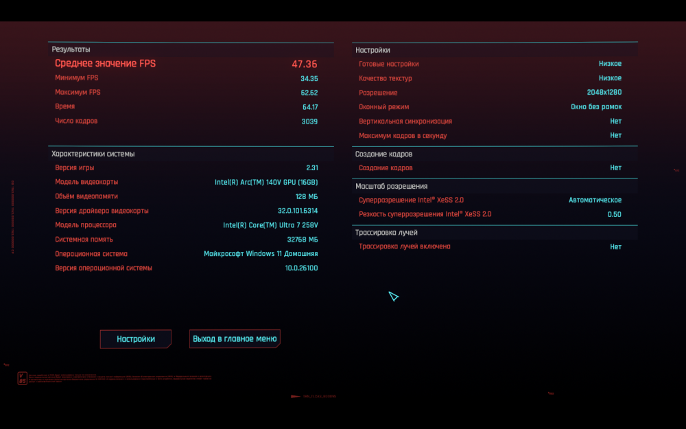 Поскольку у нас на тесте мощный ноутбук, мы протестировали запуск игр. Забегая вперед, можно резюмировать: Acer Swift Go 16 AI в свободное от работы время можно использовать для запуска игр. Мы тестировали ноутбук с игрой CyberPunk 2077. Ниже прикладываем результаты встроенного в игру бенчмарка. Вот что у нас вышло по средним значениям частоты кадров в секунду:
