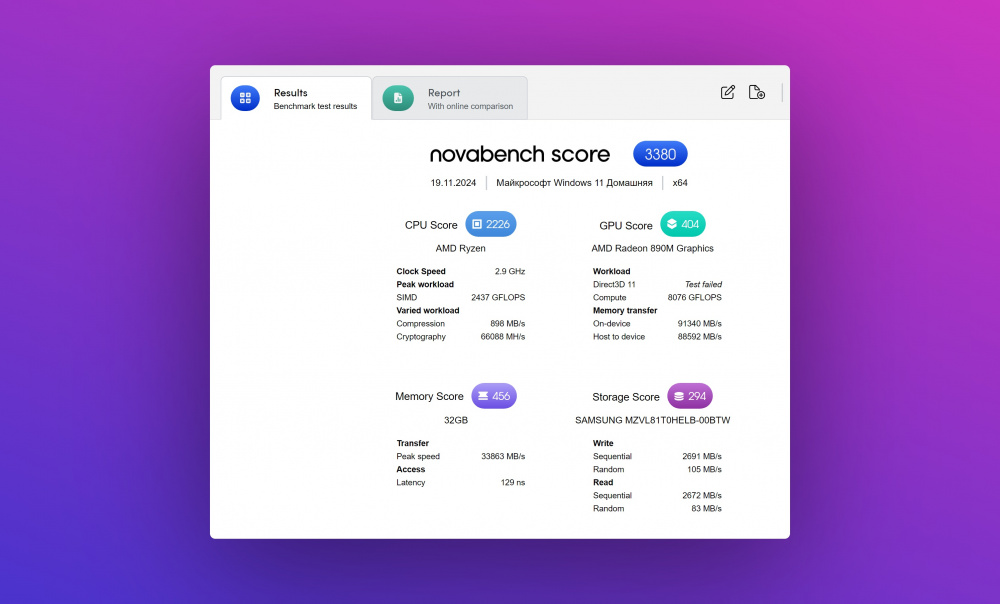 Мы протестировали ноутбук в Cinebench, CristalDiskMark и Novabench. Результаты тестирования вы сможете найти на скриншотах ниже: