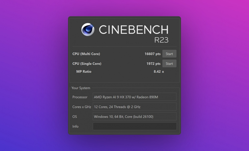 В нашей тестовой конфигурации используется процессор AMD AMD Ryzen AI 9 HX 370 (2 ГГц, 36 МБ кеш-памяти, 12 ядер, 24 потока) с графикой AMD Radeon 890M и нейронным процессором AMD XDNA NPU (до 50 TOPS). Объем оперативной памяти составляет 32 ГБ, а ёмкость накопителя — 1 ТБ.