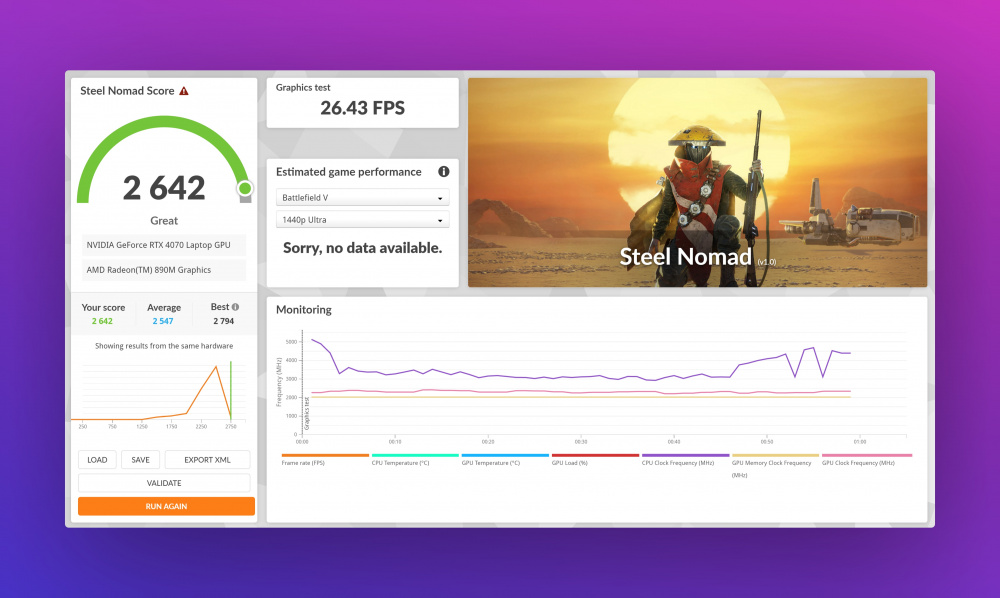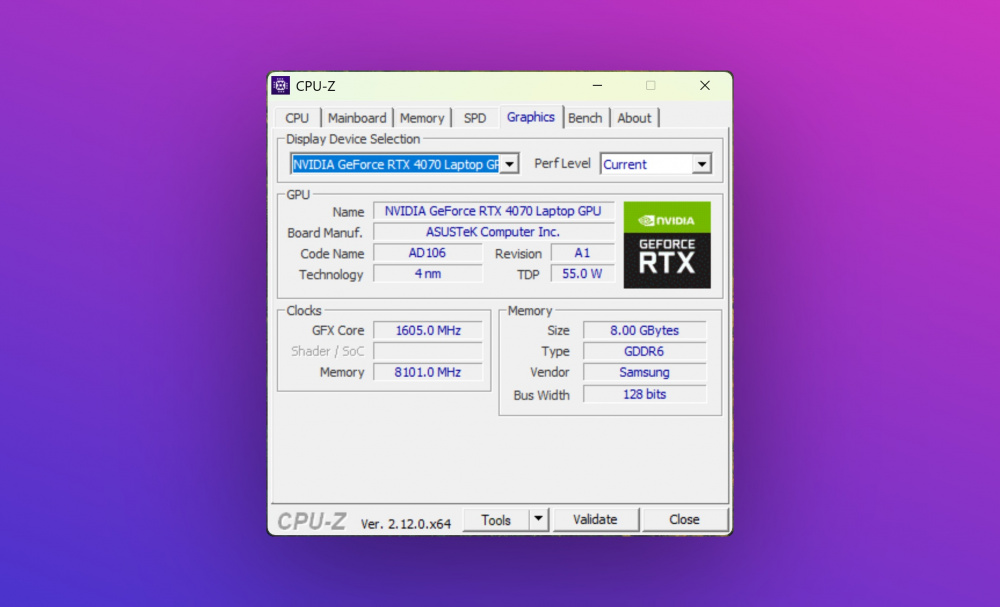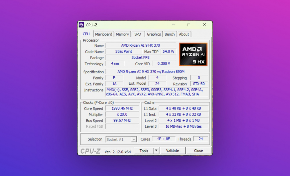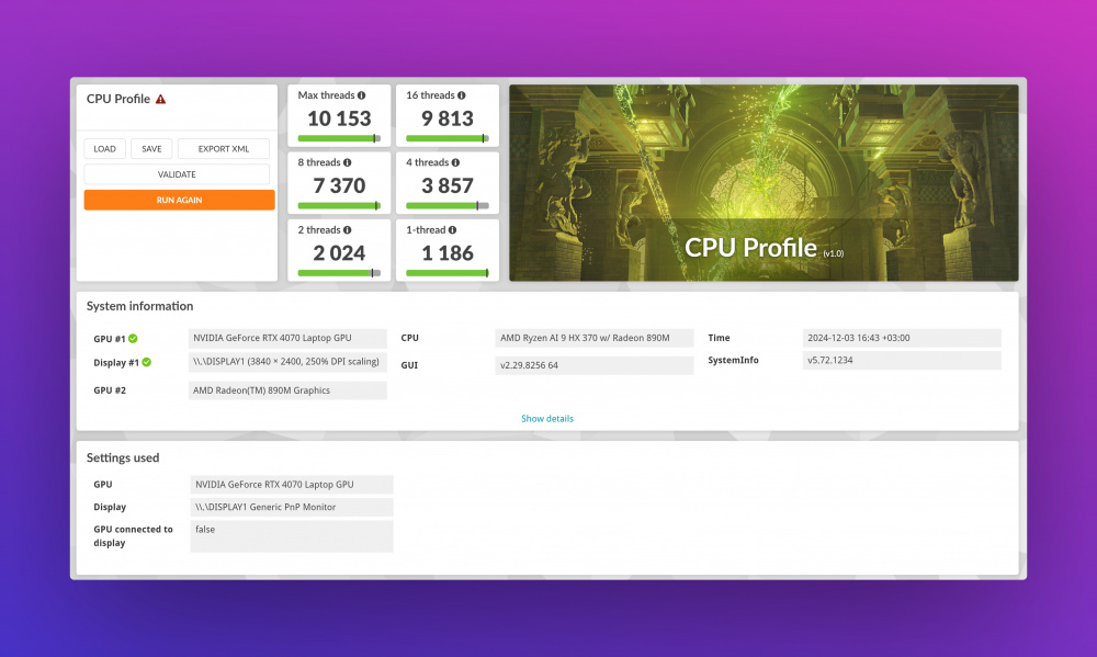 В качестве аппаратной платформы нашей тестовой конфигурации используется процессор AMD Ryzen AI 9 HX 370 2,0 ГГц (36 МБ кеш-памяти, до 5,1 ГГц, 12 ядер, 24 потока), дискретная видеокарта NVIDIA GeForce RTX 4070 с 8 ГБ видеопамяти, 64 ГБ ОЗУ типа LPDDR5X и накопитель M.2 NVMe PCIe 4.0 SSD ёмкостью 2 ТБ. Подробности на скриншотах ниже: