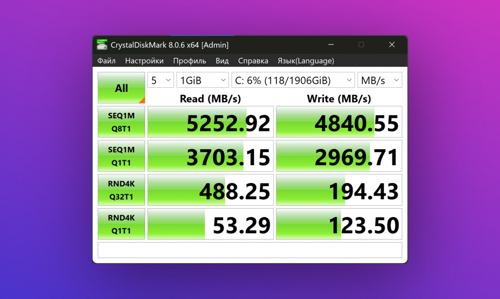 Мы протестировали ноутбук в Cinebench, CristalDiskMark и 3DMark. С результатами бенчмарков вы сможете ознакомиться на скриншотах ниже: