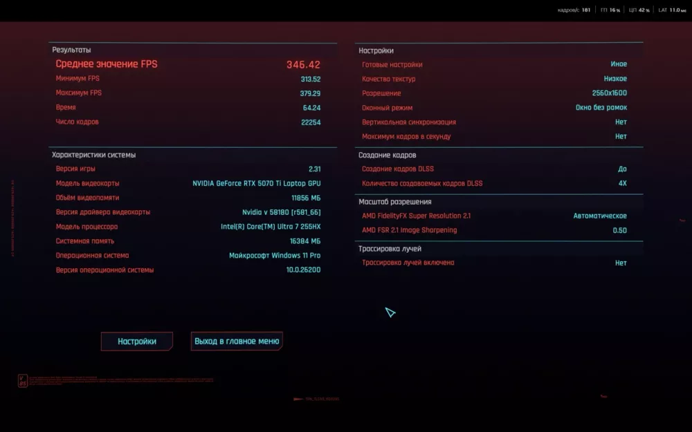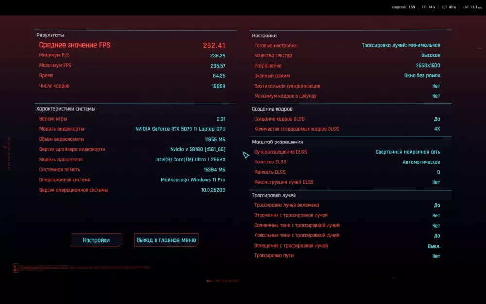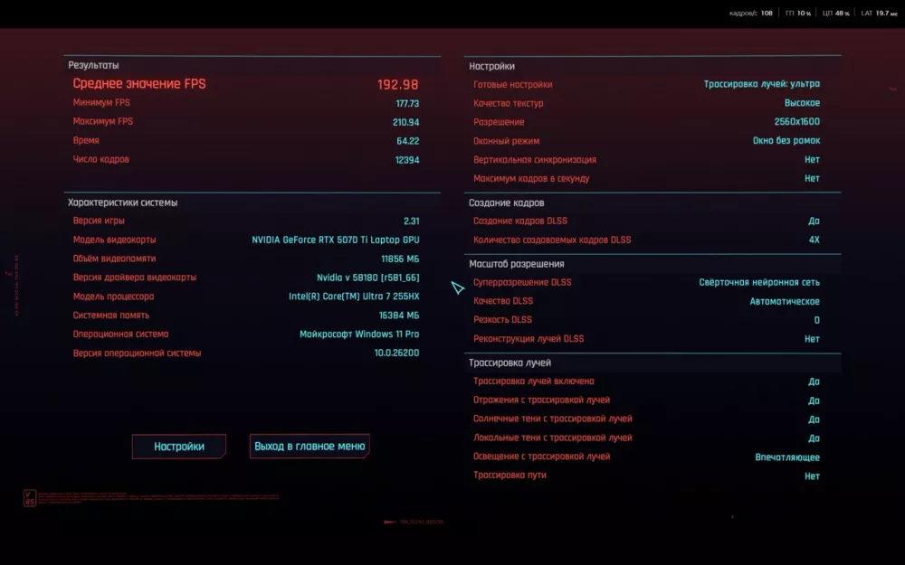 На скриншотах ниже вы сможете ознакомиться с результатами встроенного бенчмарка в игру Cyberpunk 2077. Процессор Ultra 7 показывает высокую многопоточную производительность: рендеринг, кодирование, графические задачи, симуляции — всё выполняется быстро. В Premiere Pro с поддержкой GPU-ускорения он выдаёт рендер примерно на уровне десктопного Core i7 13700.