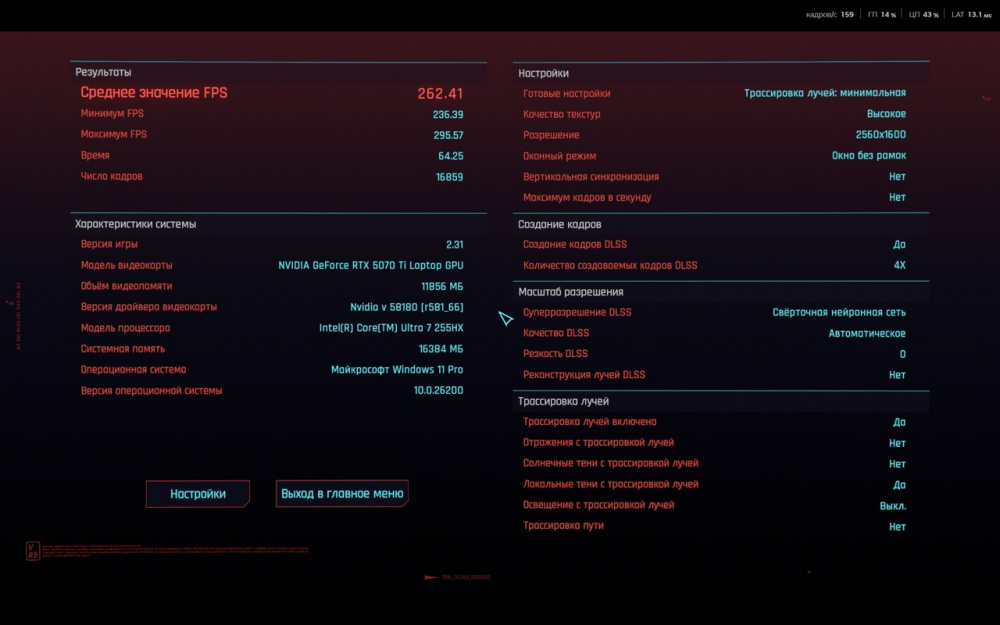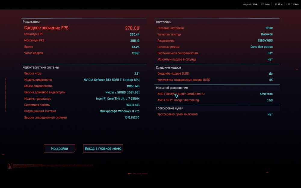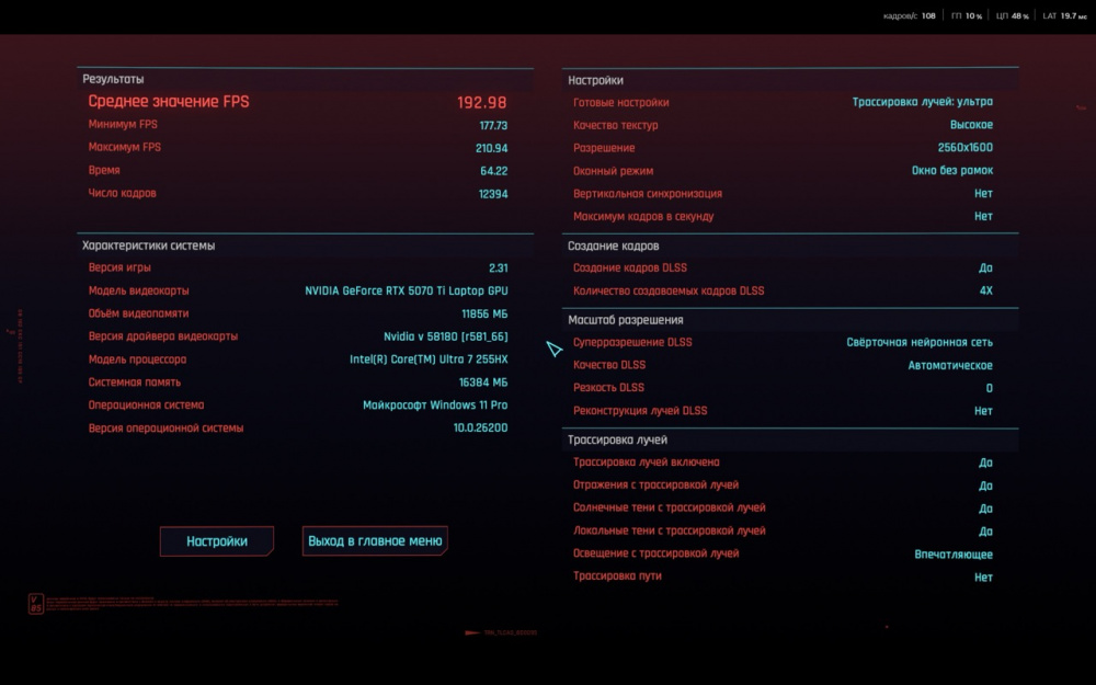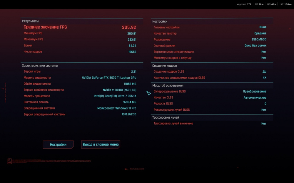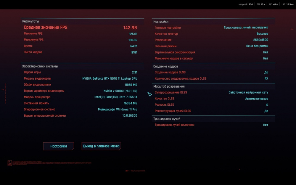 На скриншотах ниже вы сможете ознакомиться с результатами встроенного бенчмарка в игру Cyberpunk 2077. Процессор Ultra 7 показывает высокую многопоточную производительность: рендеринг, кодирование, графические задачи, симуляции — всё выполняется быстро. В Premiere Pro с поддержкой GPU-ускорения он выдаёт рендер примерно на уровне десктопного Core i7 13700.