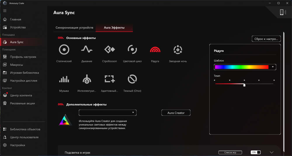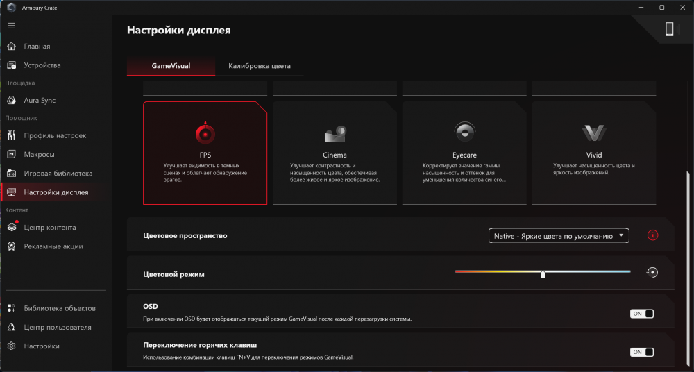 Главный центр управления — Armoury Crate. Здесь настраивается подсветка, профили охлаждения, сеть, управление Panel Overdrive, мониторинг вентиляторов, обновления BIOS и драйверов.