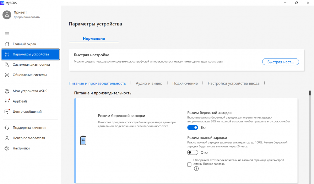 В качестве программной платформы используется операционная система Windows 11 Домашняя. На ноутбуке предустановлена фирменная утилита MyASUS. Она позволяет:- выбрать режимы зарядки;