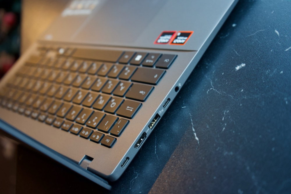 Слева расположены два порта USB-C, HDMI, один USB-A и 3,5 мм аудиоразъем для проводной гарнитуры. Справа: один USB-A и два светодиода индикаторов состояния. Набор портов можно назвать оптимальным. Во всяком случае, во время теста необходимости в дополнительном хабе не возникло.