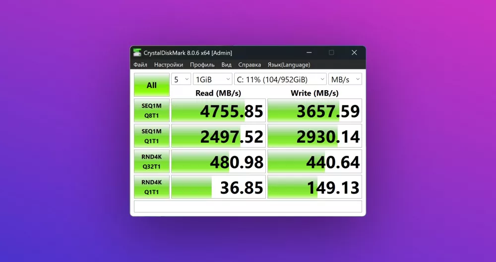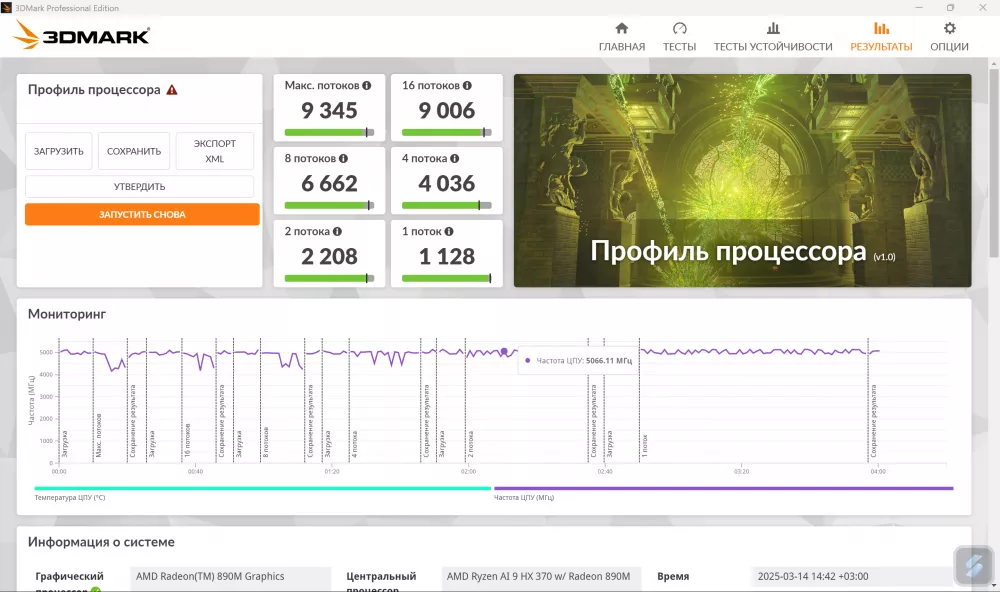 В качестве аппаратной платформы ультрабук получил процессор AMD Ryzen AI 9 HX 370 2,0 ГГц (36 МБ кеш-памяти, до 5,1 ГГц, 12 ядер, 24 потока), нейропроцессор AMD XDNA NPU (до 50 TOPS) и графику AMD Radeon 890M. В нашей тестовой конфигурации 32 ГБ оперативной памяти (типа LPDDR5X) и накопитель на 1 ТБ (M.2 NVMe PCIe 4.0 SSD). Мы протестировали ноутбук в Cinebench, CrystalDiskMark и Geekbench. Скриншоты с результатами — ниже. Также мы протестировали графику в 3DMark: Производительности хватает для офисных задач, пакетной обработки RAW-фото и лёгкого монтажа 4K-видео. К примеру, Genshin Impact стабильно выдаёт 60 FPS на высоких настройках в 1200p.За охлаждение отвечает система IceCool. В нее входят две тепловые трубки и два вентилятора. Она справляется хорошо даже на пиковых нагрузках. Регулировать работу вентиляторов можно с помощью утилиты MyASUS в разделе «Питание и производительность». Там доступно четыре режима работы.