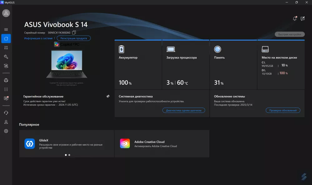 Из коробки наш тестовый ASUS VivoBook S 14 работает на Windows 11 «Домашняя». Благодаря встроенному нейропроцессору устройство готово к работе с искусственным интеллектом. На клавиатуре имеется выделенная кнопка для запуска ИИ-помощника Copilot.На ноутбуке предустановлены три фирменные утилиты от производителя: