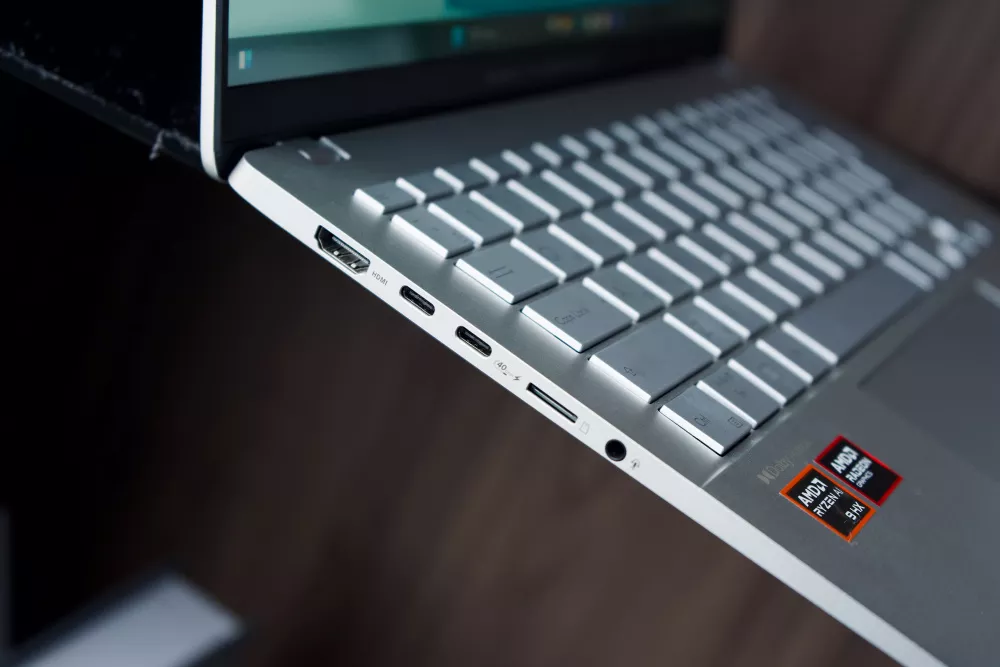 На правой грани размещены: HDMI 2.1, USB-С 3.2 Gen 1, USB-С 4.0 Gen 3, кард-ридер для microSD и разъем 3,5 мм для проводной гарнитуры. На левой — два USB-A 3.2 Gen 1. Все порты USB-C устройства поддерживают питание и подключение мониторов. Набор разъемов полностью закрывает все основные сценарии. Нехватки портов и потребности в USB-хабе во время тестирования не возникло.