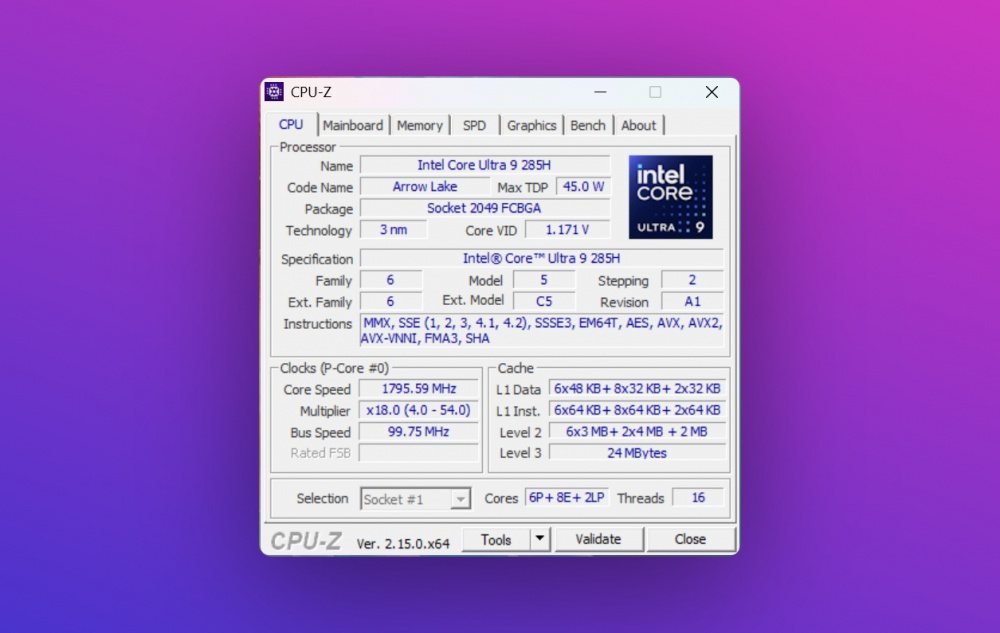 - Процессор: Intel Core Ultra 9 285H 2,9 ГГц (24 МБ кеш-памяти, до 5,4 ГГц, 16 ядер, 16 потоков)