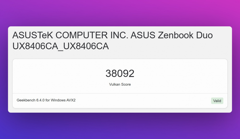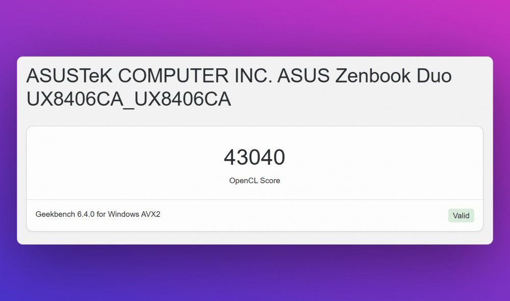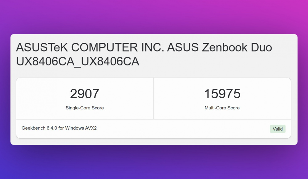 В качестве аппаратной платформы используется процессор Intel Core Ultra 9 285H 2,9 ГГц с нейронным чипом Intel AI Boost NPU и графикой Intel Arc Graphics. Объем оперативной памяти составляет 32 ГБ типа LPDDR5X, а емкость накопителя — 1 ТБ (M.2 NVMe PCIe 4.0). Мы протестировали ноутбук в Cinebench, CrystalDiskMark и Geekbench. Ниже прикладываем скриншоты с результатами бенчмарков. Как вы уже смогли понять по спекам, в нашем обзоре не игровое решение. Об этом говорит отсутствие дискретной графики. ASUS Zenbook DUO (UX8406C) — это в первую очередь устройство про работу: текст, таблицы, презентации, рисование и работа с фото. Для всего в устройстве достаточно производительности.