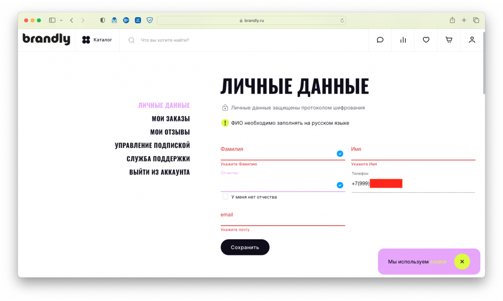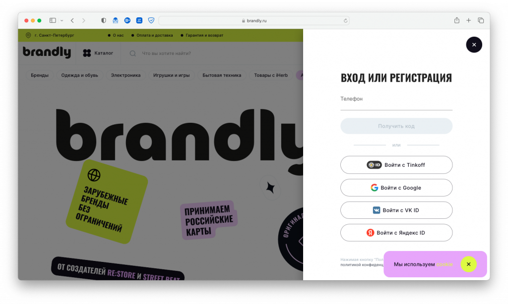 Зарегистрироваться в Brandly можно с помощью номера телефона, а также входом с учетной записью Тинькофф, Google, VK и Яндекса. Я выбрал способ с номером телефона.