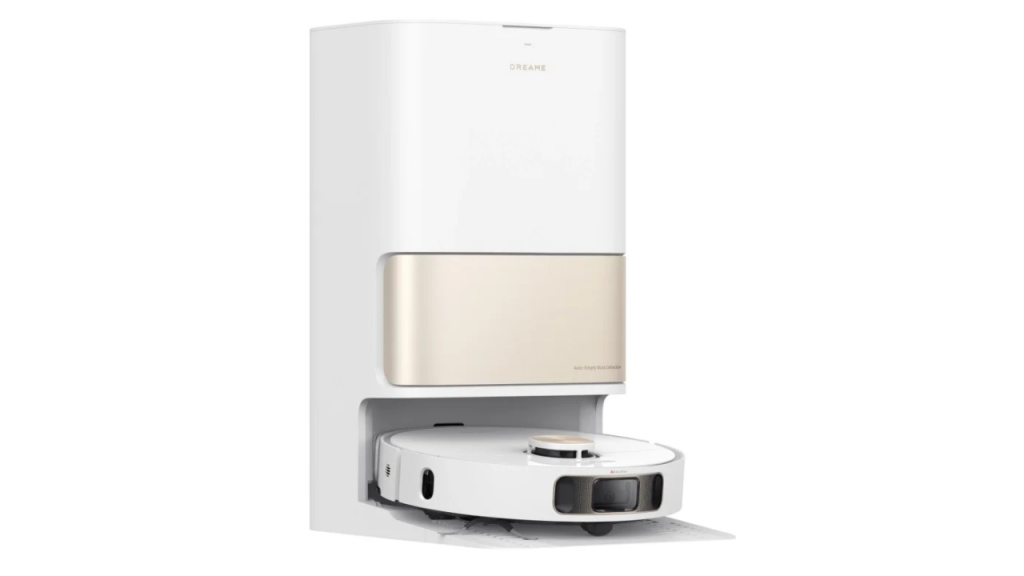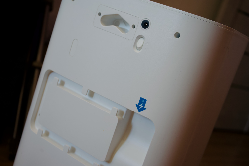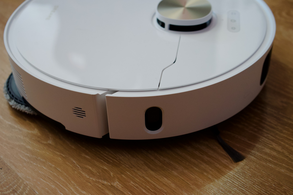 Базовая станция смотрится лаконично — устройство вписывается в любой интерьер и не оттягивает на себя внимание. Стоит отметить, что в белой башенке есть акцент нежно-золотистого цвета — это отсек пылесборника и контейнера для чистящего средства. К этому элементу конструкции у меня возник «вопросик». Крышка фиксируется на корпусе методом «примагничивания». Если её не задевать, то она хорошо удерживается на своём месте. Однако она выпадает, если станцию наклонить или задеть крышку — это может сделать кот, который решил поспать на поверхности станции. На мой взгляд, наиболее эргономичным решением было бы установить крышку на петли.