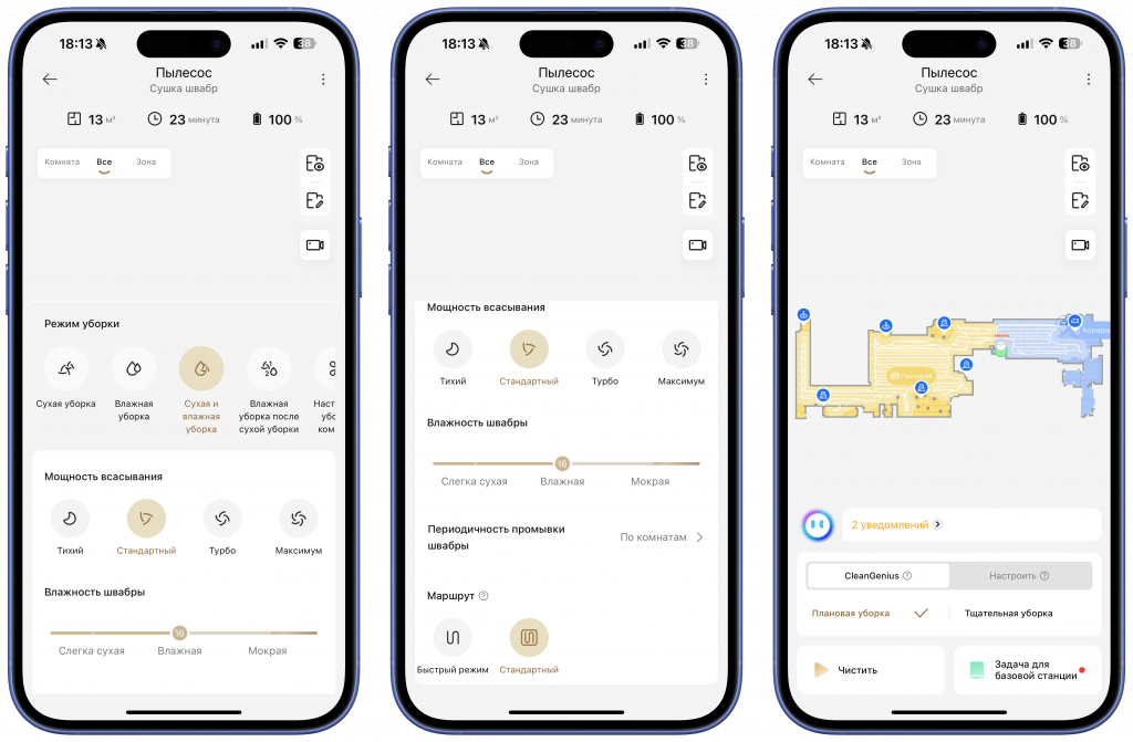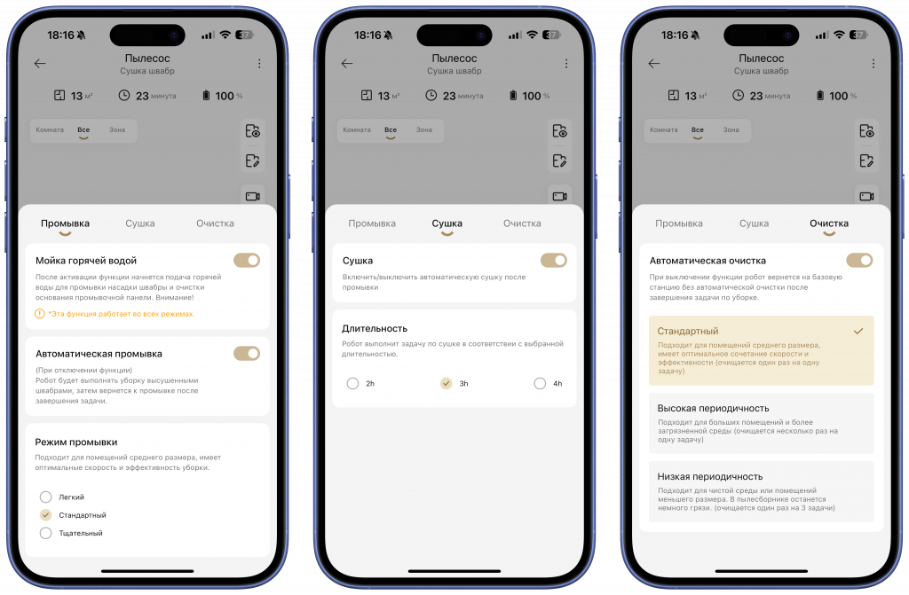 Приложение позволяет настраивать уборку. Доступны следующие варианты:
